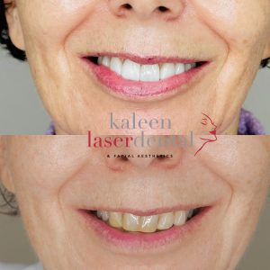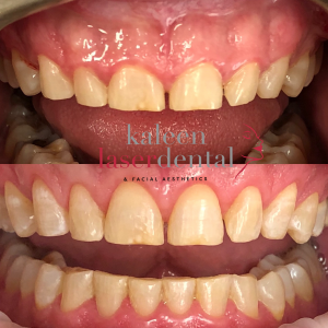 Using both hard- and soft-tissue lasers —specifically the Fotona LightWalker — we perform the gum lift using a flapless technique. The predetermined gum contour is gently sculpted with the laser, followed by laser-assisted bone reshaping performed beneath the gum without raising a traditional flap.