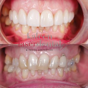 Depending on the extent of the procedure, new restorations or cosmetic crowns/veneers may be completed immediately or delayed 6–11 weeks to allow tissues to stabilise.